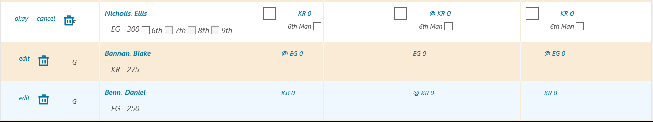 By editing a row, it turns from the normal background into a background having a white appearing color. Here, Ellis is being reassigned with personal separation; no one else can undergo lineup change until done with editing his row.