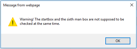 Once you’ve entered, and “okayed”, all of your starters and 6th men to your satisfaction, double-check your center, forward and guard counts. We don’t have the system error-checking for lineup violations yet –hope to at some point, though –so please do your own error-checking that you’ve met the 4 center, 8 forward and 8 guard game requirements.