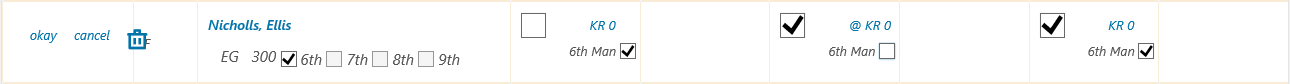 When you’ve completed entering lineup information for any player, you must click “okay” to the left of the player’s name to save his data before you can proceed to your next player. Each time you “okay” a player in your lineup, you’ll see indications on the schedule grid of your choices: